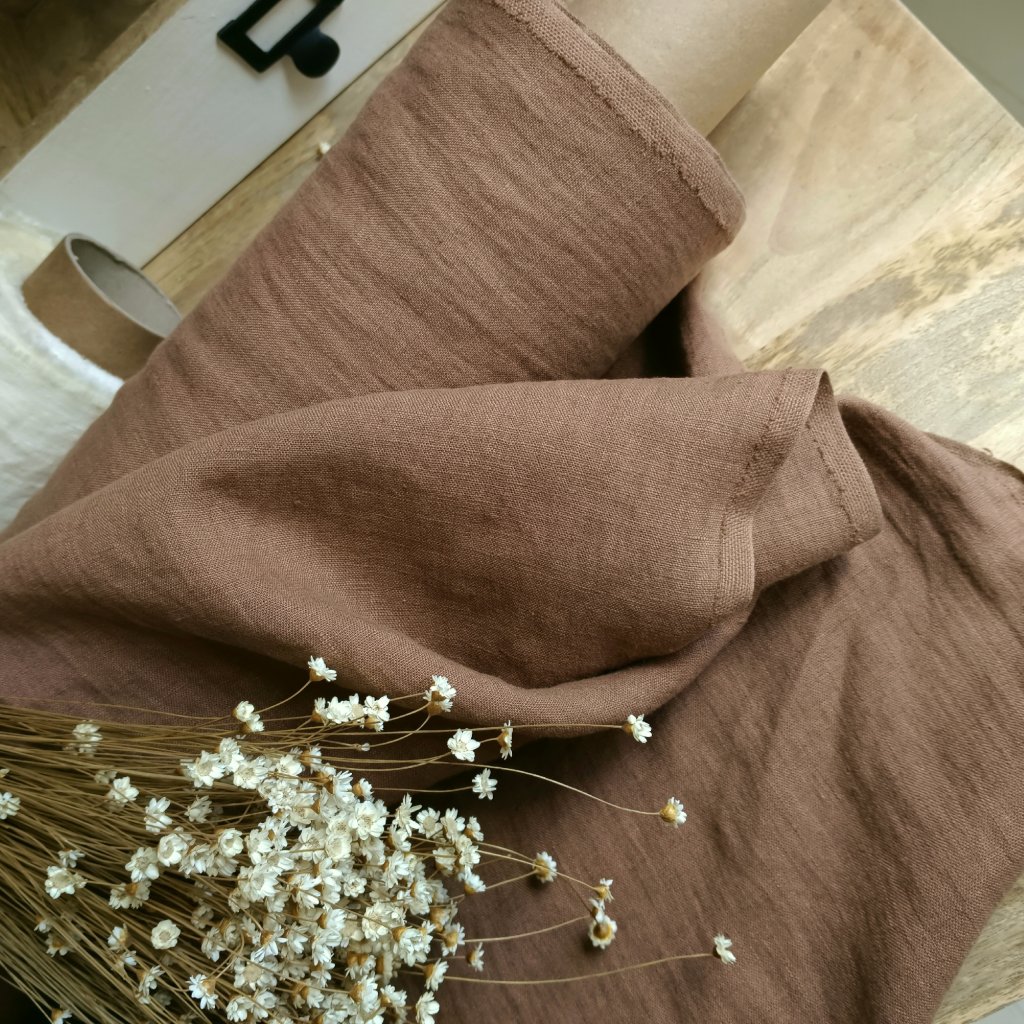 č.20....100% len metráž odstín CHOC BROWN 205g/m2, len vysrážený, předepraný, měkčený. Krásně se doplňuje s odstíny CINNAMON, TERRACOTTA, RUST, SMOKE BROWN/WHITE stripes