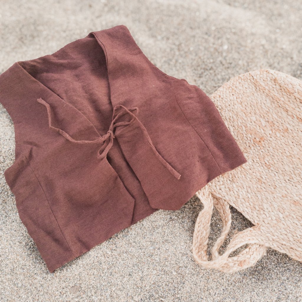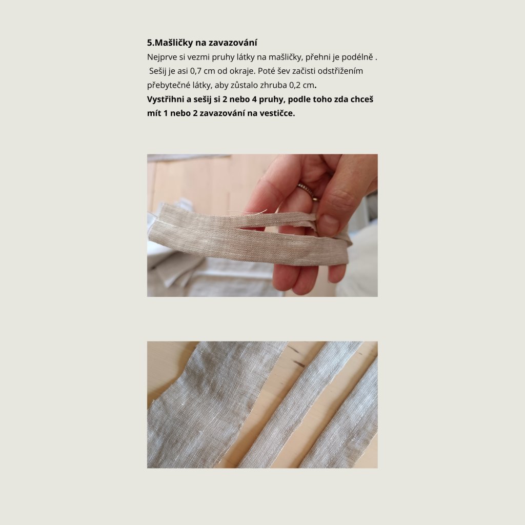 Kouzlo této vestičky je v jednoduchosti – ušít ji zvládne i začátečník, a přesto působí originálně. Mašličky jí dodávají jemný romantický nádech a díky možnosti oboustranného nošení z jedné vesty snadno vytvoříte dva různé kousky. Stačí z jedné strany zvolit vzor – třeba proužek nebo kostičku – a z druhé jednobarevný len. Hodí se do práce, na procházku, na pláž i na večer; na chladnější dny stačí doplnit ručně pleteným svetrem nebo sakem, krásně bude vypadat i s kardiganem nebo koženou bundou, pro ten správný vibe:O)