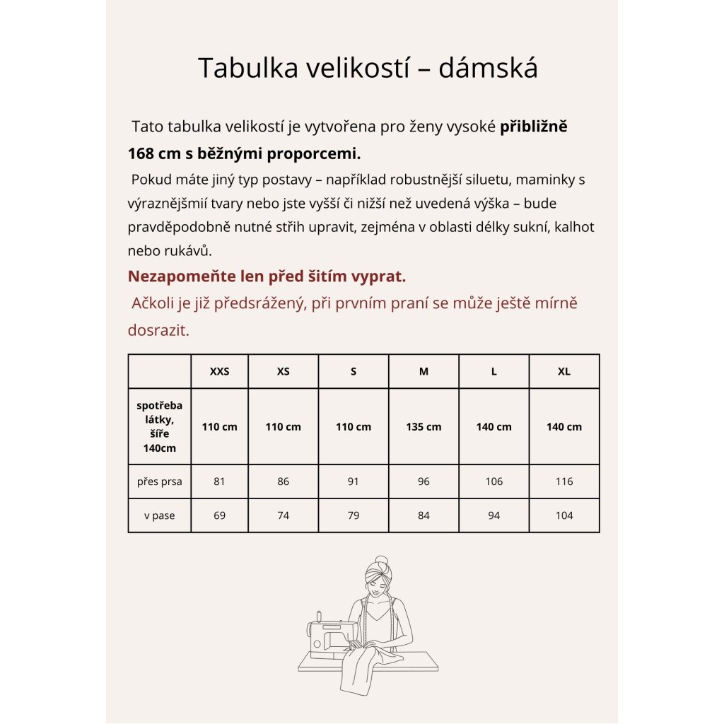 Pokud máte jiný typ postavy – například robustnější siluetu, maminky s výraznějšmií tvary nebo jste vyšší či nižší než uvedená výška – bude pravděpodobně nutné střih upravit, zejména v oblasti délky sukní, kalhot nebo rukávů.