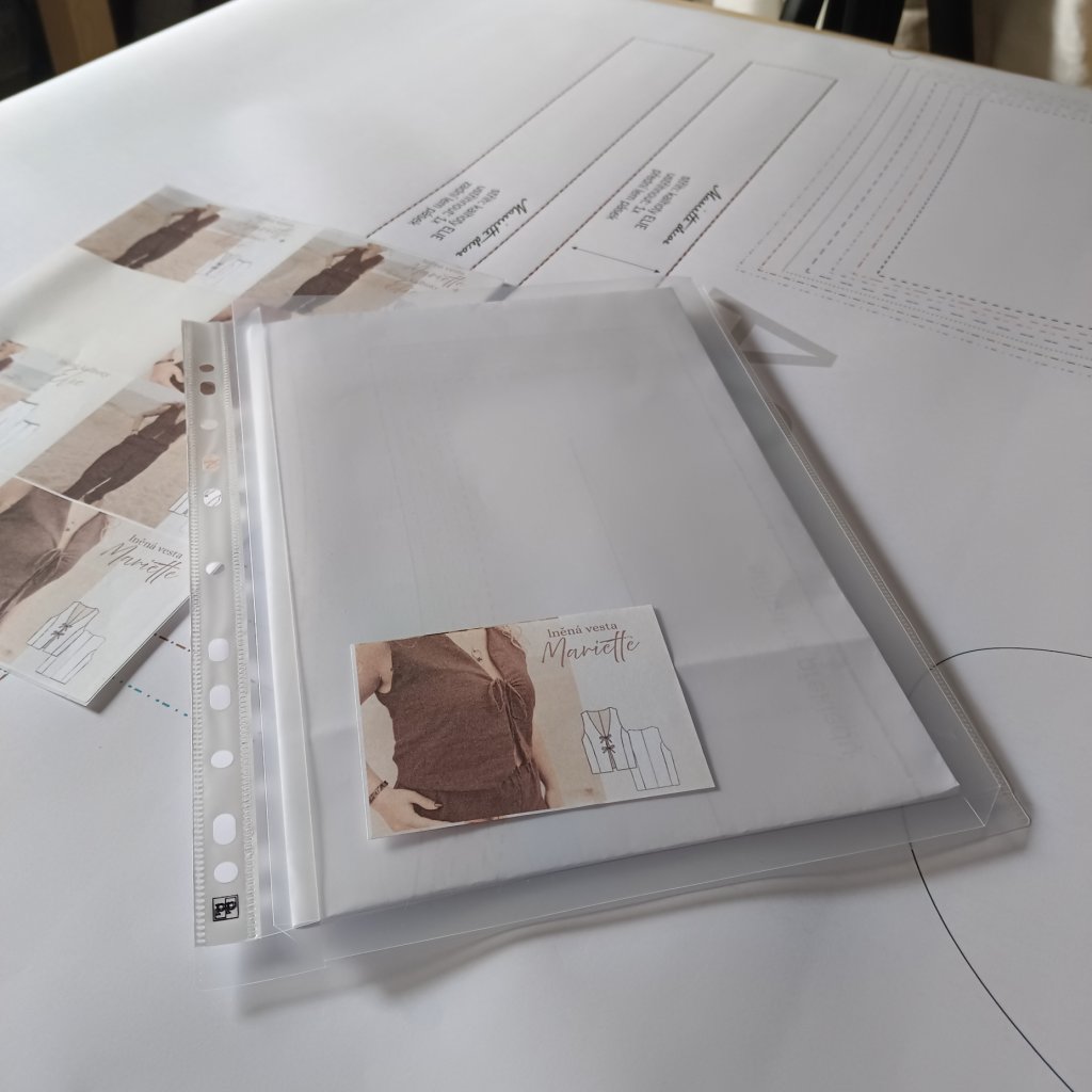 Aby v šicím koutku nebyl zmatek, každý střih od nás dostanete uložený ve velké průhledné obálce — můžete si ji pohodlně založit do šanonu, mít všechny střihy přehledně srovnané a po ruce.