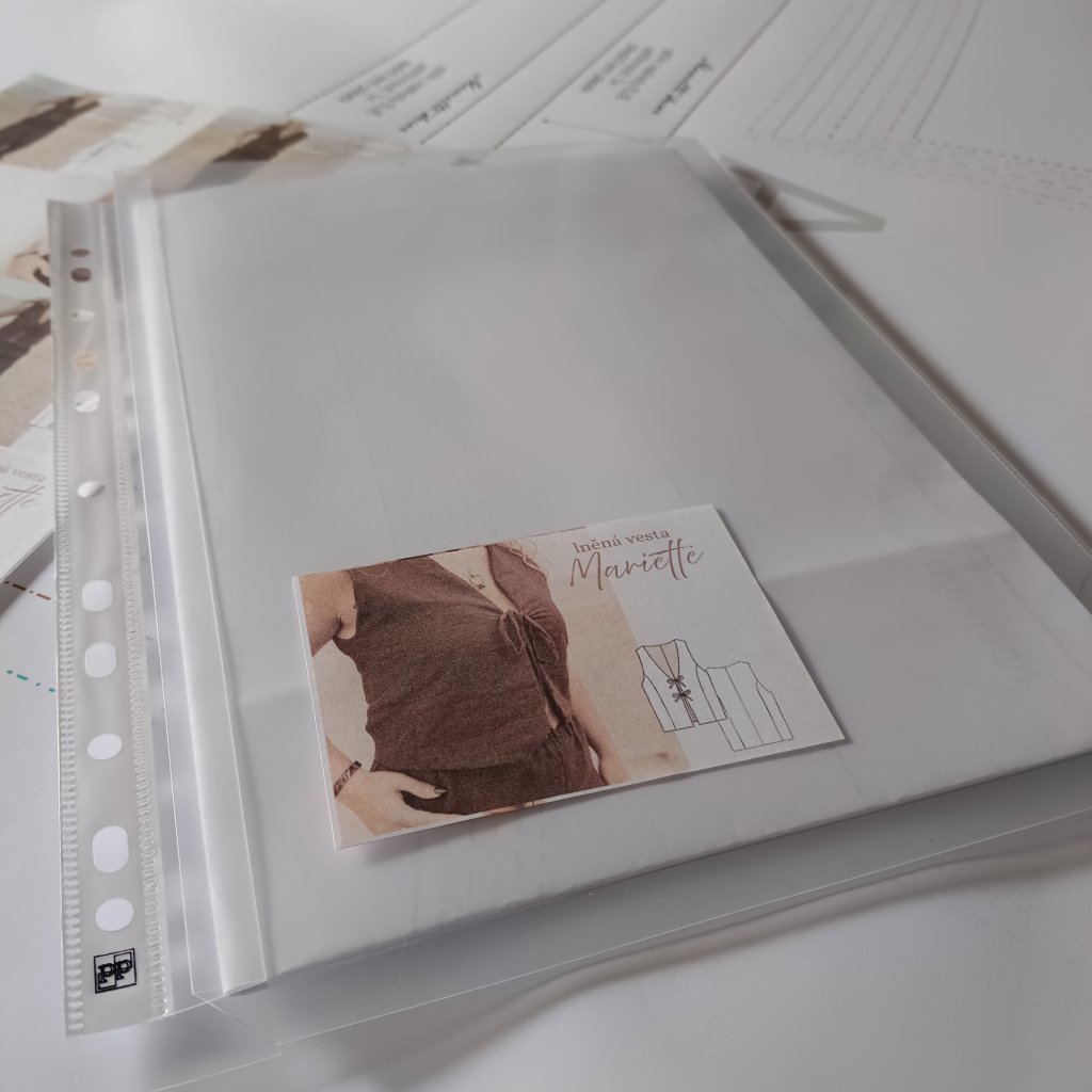 Aby v šicím koutku nebyl zmatek, každý střih od nás dostanete uložený ve velké průhledné obálce — můžete si ji pohodlně založit do šanonu, mít všechny střihy přehledně srovnané a po ruce.