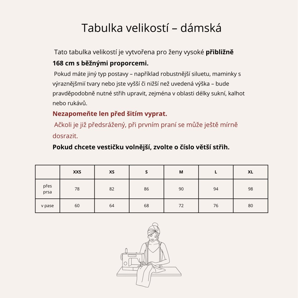 Její kouzlo je v jednoduchosti – ušít ji zvládne i začátečník, a přesto působí originálně. Mašličky jí dodávají jemný romantický nádech a díky možnosti oboustranného nošení z jedné vesty snadno vytvoříte dva různé kousky. Stačí z jedné strany zvolit vzor – třeba proužek nebo kostičku – a z druhé jednobarevný len.