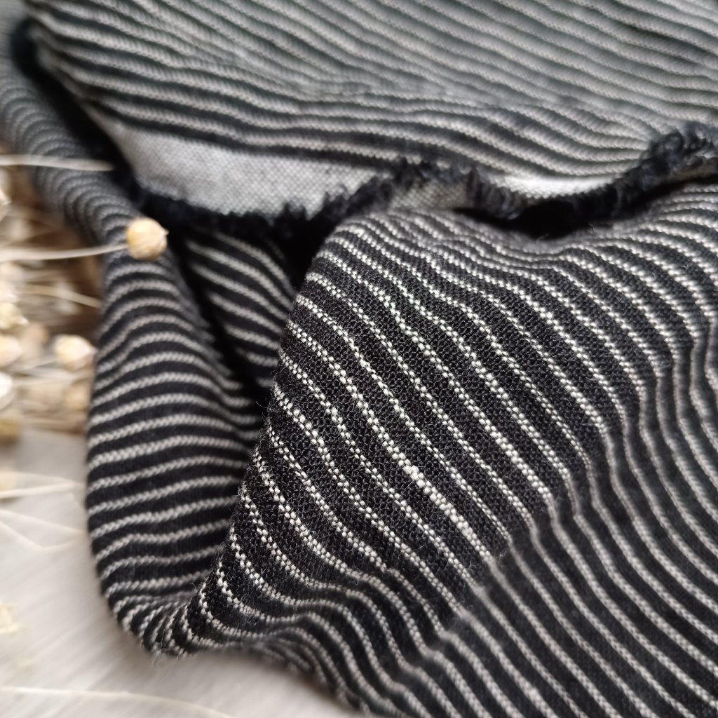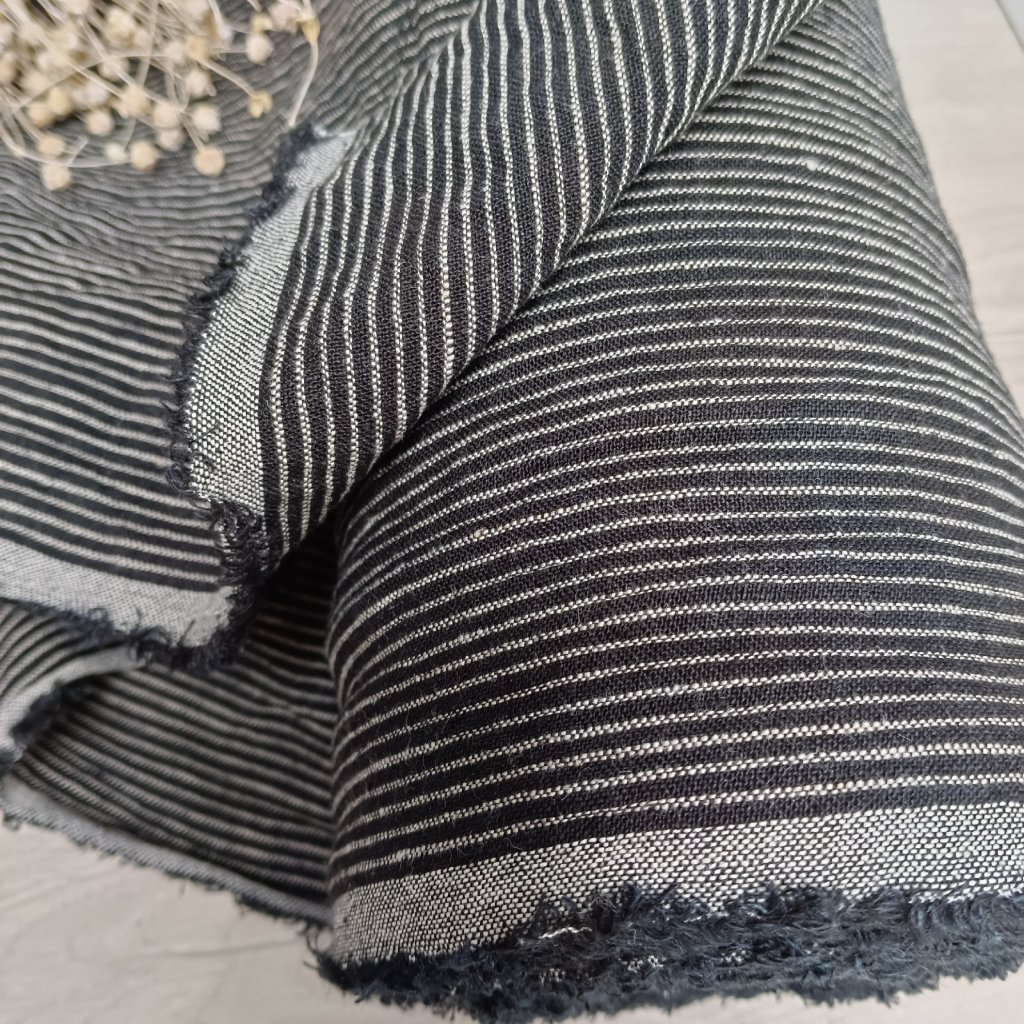 Tenhle kousek lněné látky má v sobě kouzlo jednoduchosti – decentní proužek v černobílém kontrastu, který dodá každému projektu eleganci i trochu francouzského šarmu.